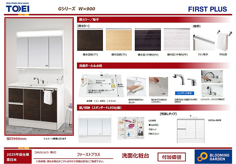 また洗面化粧台は吐水口が引き出せお掃除にも便利です。ミラー裏にはたっぷりと収納でき、メイクにも便利な三面鏡タイプです。