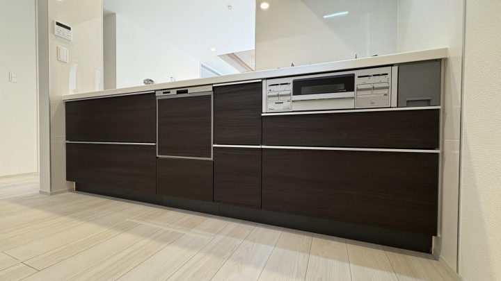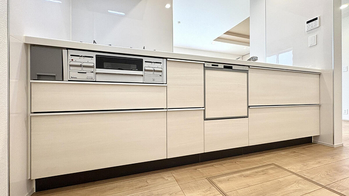 キッチンには、ボタン操作ひとつで油汚れをスッキリ!ビルトインタイプのスマート設計の食器洗浄乾燥機をご用意致しました。