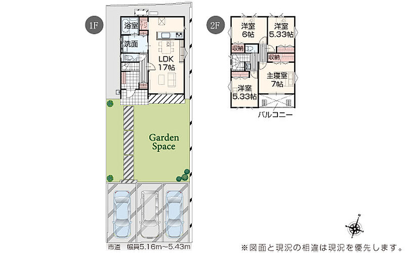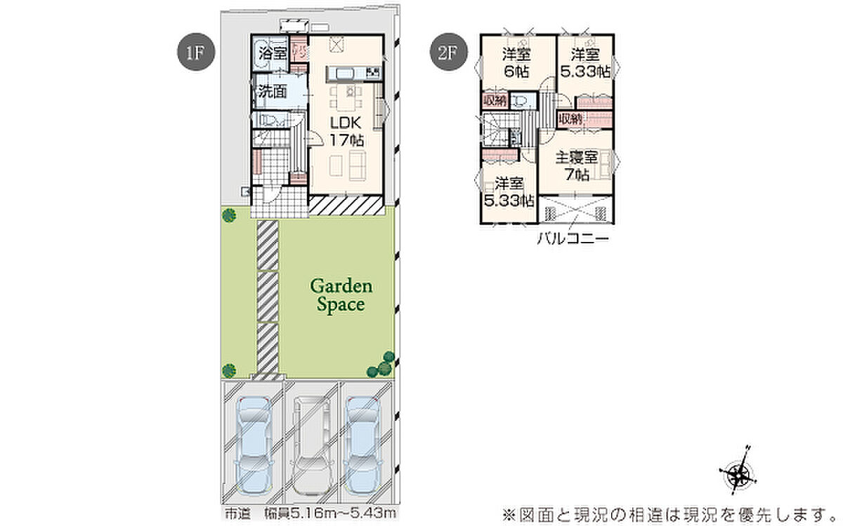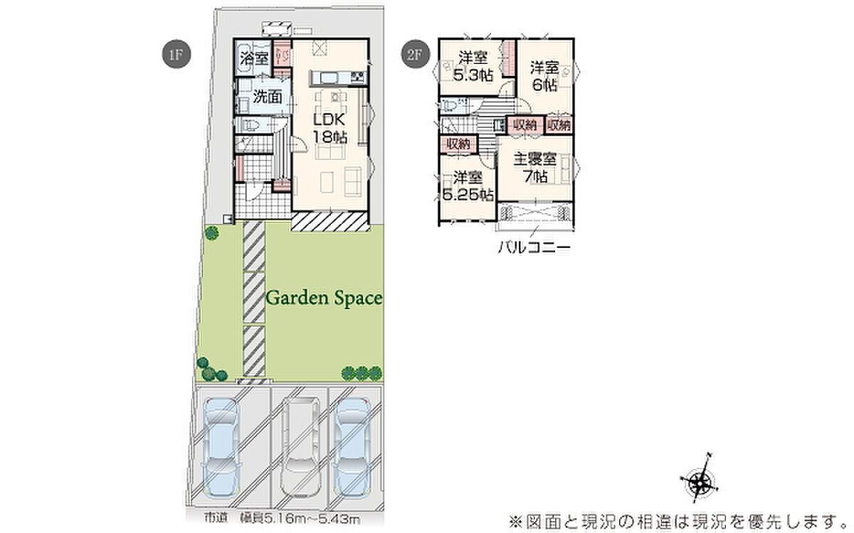 | 駐車場 | 3台 | 道路の幅員 | 道路幅 5.16 m ~ 5.43 m アスファルト舗装 |
