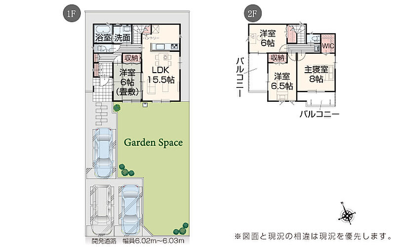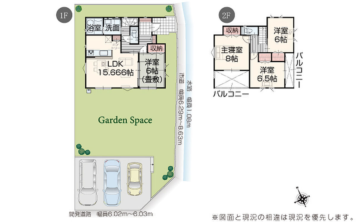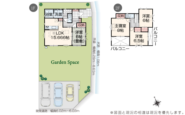 | 駐車場 | 3台 | 道路の幅員 | 道路幅 6.02 m ~ 8.83 m アスファルト舗装 |