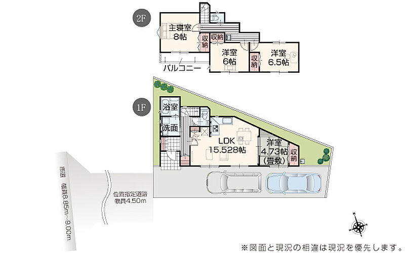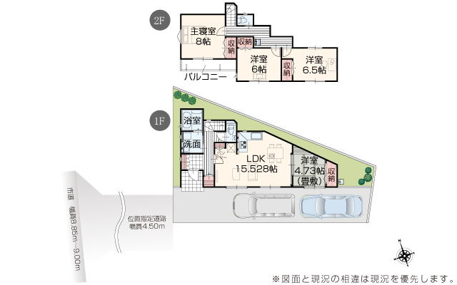 | 駐車場 | 2台 | 道路の幅員 | 道路幅 4.50 m ~ 9.23 m アスファルト舗装 |