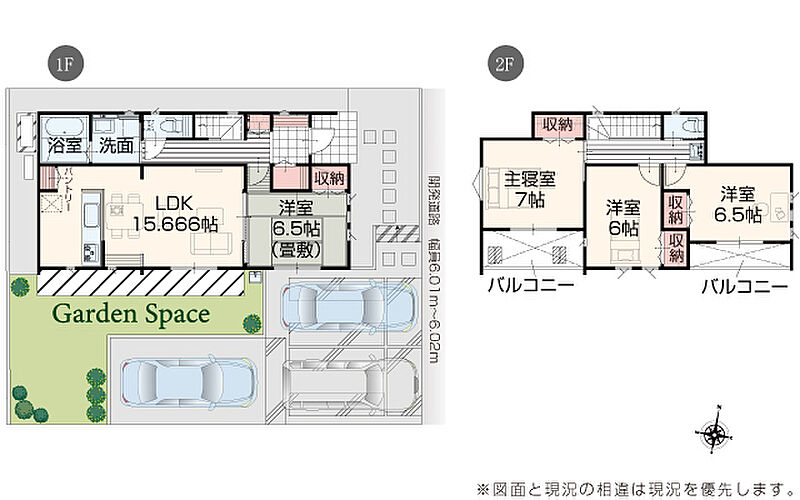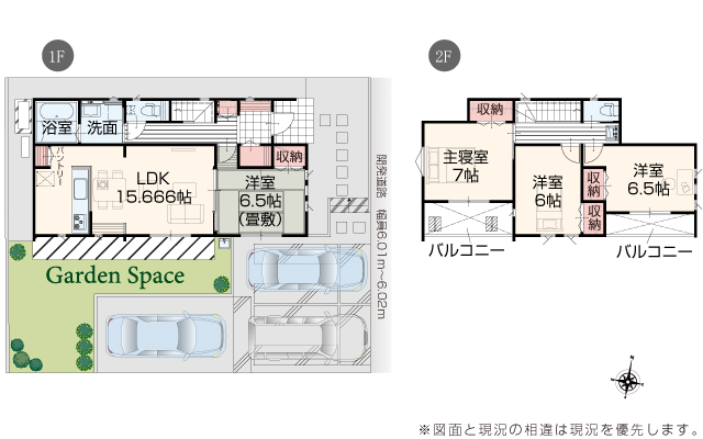 | 駐車場 | 3台 | 道路の幅員 | 道路幅 6.01 m ~ 6.02 m アスファルト舗装 |