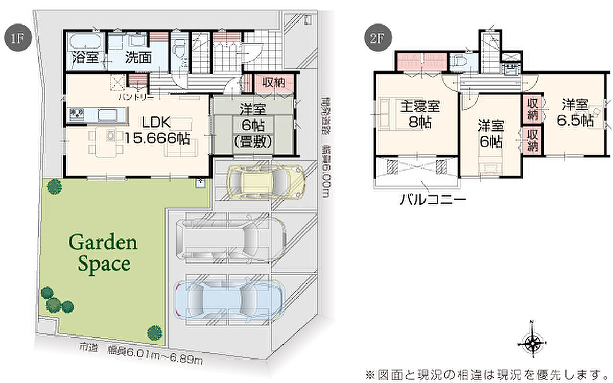 | 駐車場 | 3台 | 道路の幅員 | 道路幅 5.01 m ~ 6.89 m アスファルト舗装 |