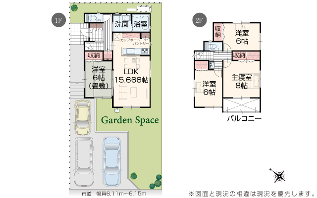| 駐車場 | 3台 | 道路の幅員 | 道路幅 6.12 m ~ 6.16 m アスファルト舗装 |