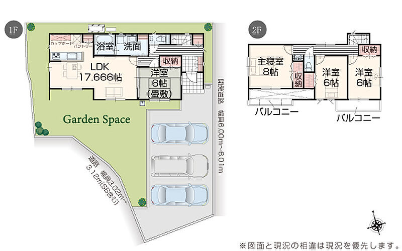 | 駐車場 | 3台 | 道路の幅員 | 道路幅 3.02 m ~ 6.75 m アスファルト舗装 |