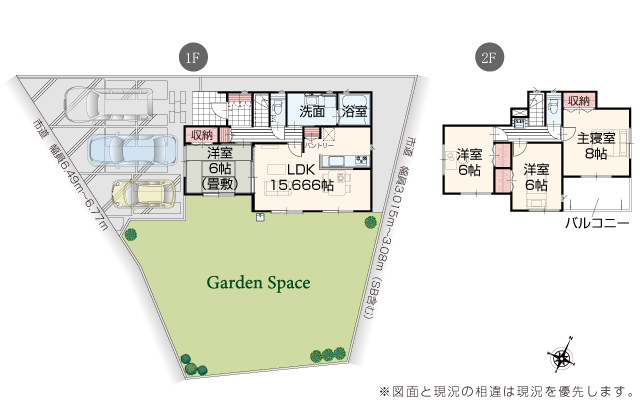 | 駐車場 | 3台 | 道路の幅員 | 道路幅 3.02 m ~ 6.77 m アスファルト舗装 |