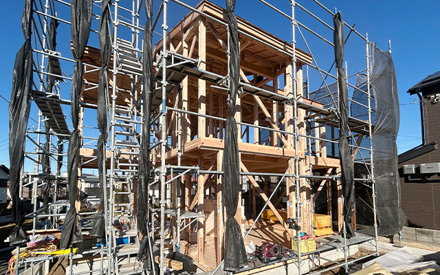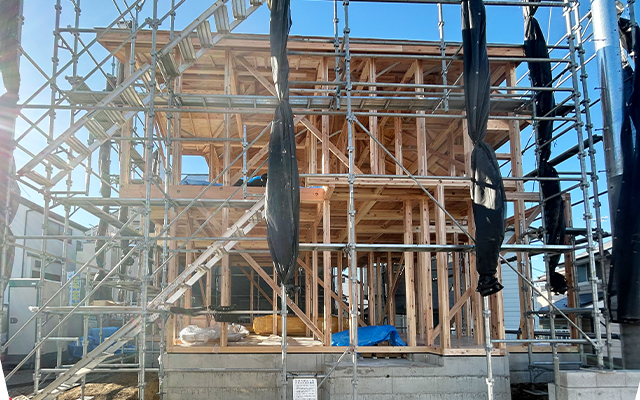 構造用合板を直接梁に留め、柱・梁と床面を一体化させる「剛床工法」を採用しています。