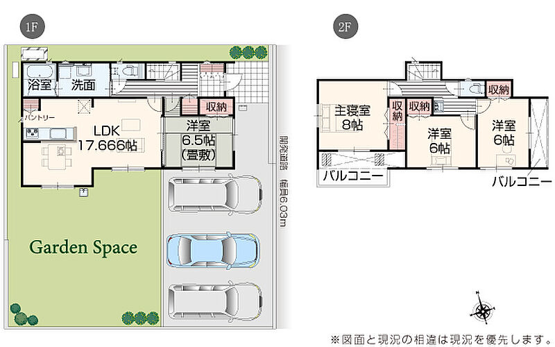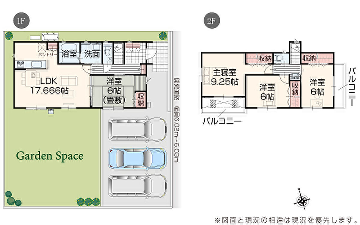 | 駐車場 | 3台 | 道路の幅員 | 道路幅 6.02 m ~ 6.05 m アスファルト舗装 |