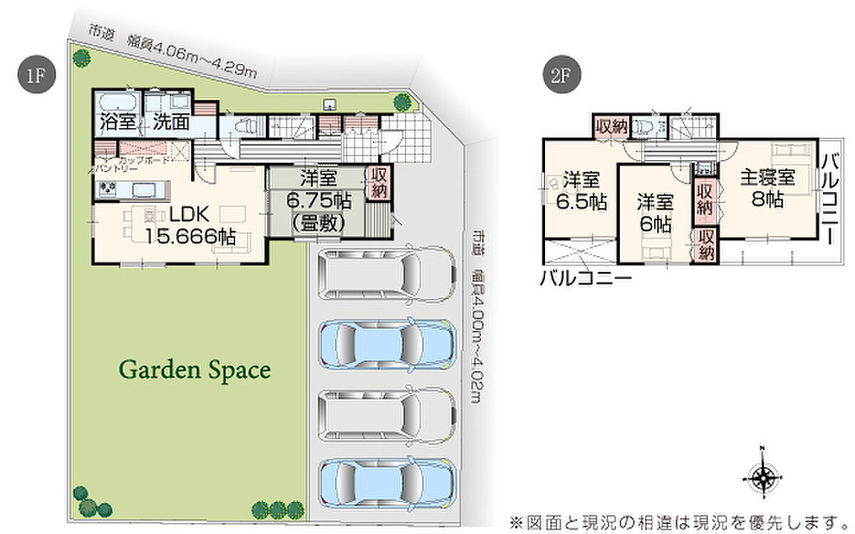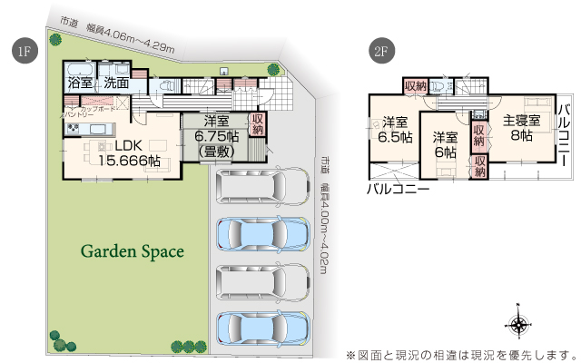 | 駐車場 | 4台 | 道路の幅員 | 道路幅 4.00 m ~ 4.29 m アスファルト舗装 |
