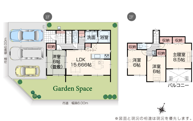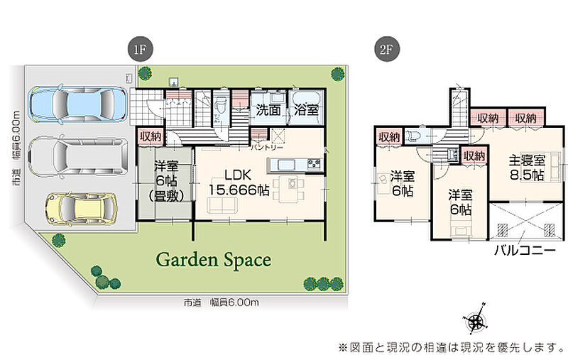 | 駐車場 | 3台 | 道路の幅員 | 道路幅 6.00 m アスファルト舗装 |