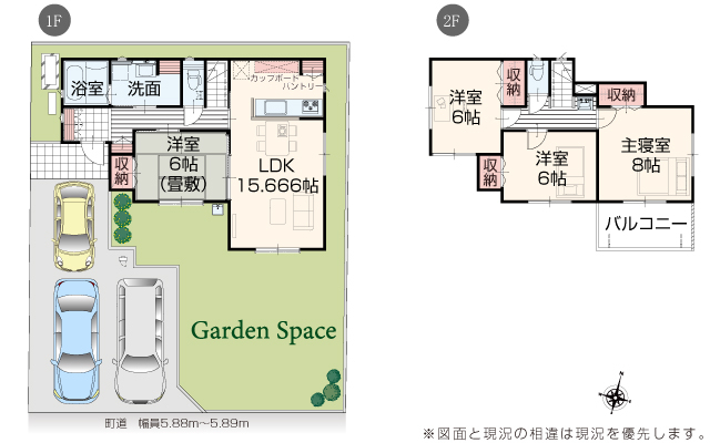 | 駐車場 | 3台 | 道路の幅員 | 道路幅 5.88 m ~ 5.90 m アスファルト舗装 |