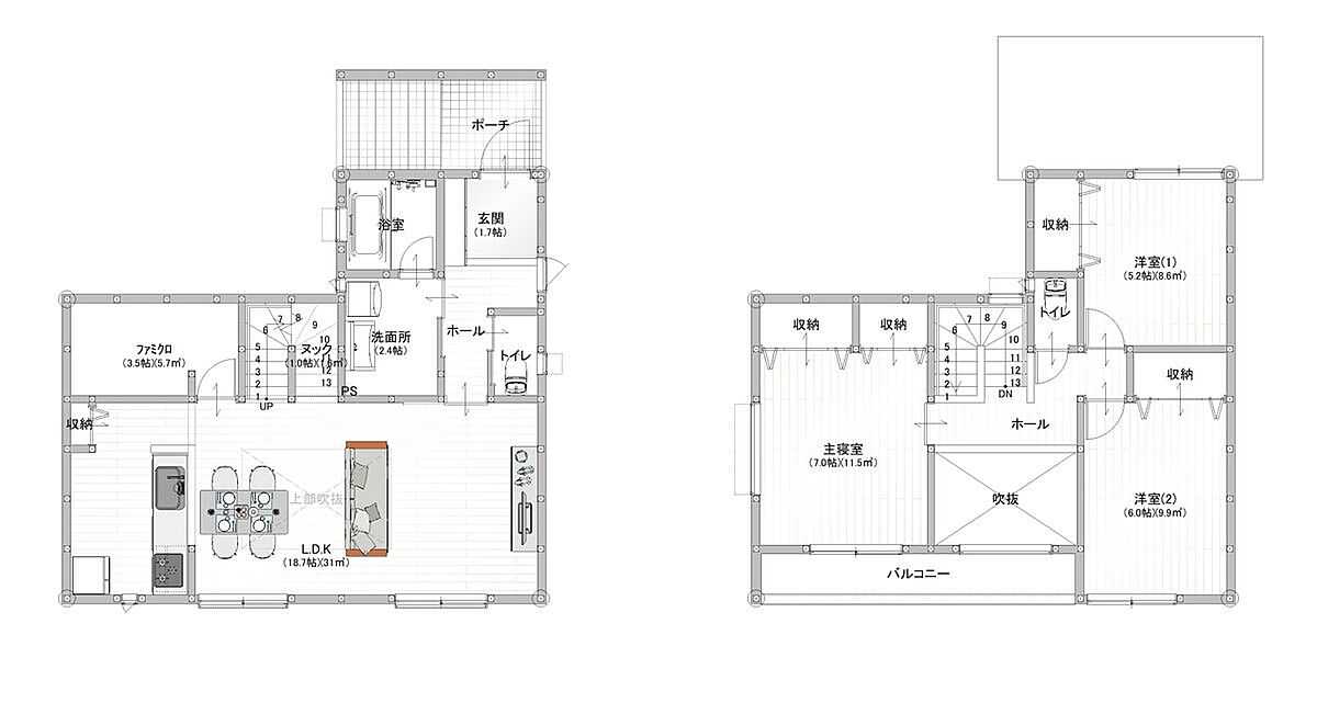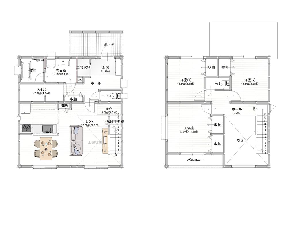 3.5帖のファミリークロゼット、パントリー、全室収納庫付き、開放感あふれるリビングの吹抜け、収納豊富な余裕の3LDKプラス3S、カースペース2台、南庭広くゆったりした敷地