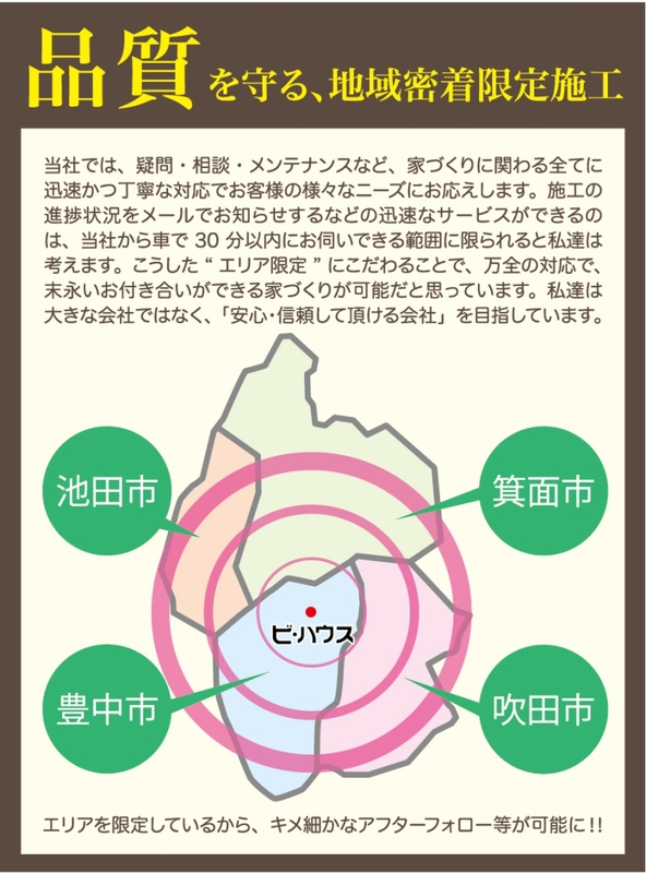 ■地元北摂のハウスメーカーが贈る分譲地。豊中市・箕面市・吹田市・池田市と当社から30分圏内で限定施工しているので万全のアフターフォローを実施しています。 住んでから安心の地域密着施工会社です。