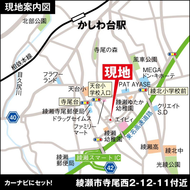 相鉄本線「かしわ台」駅 徒歩24分 小田急小田原線「海老名」駅 バス停「寺尾中央公園」 徒歩2分 |