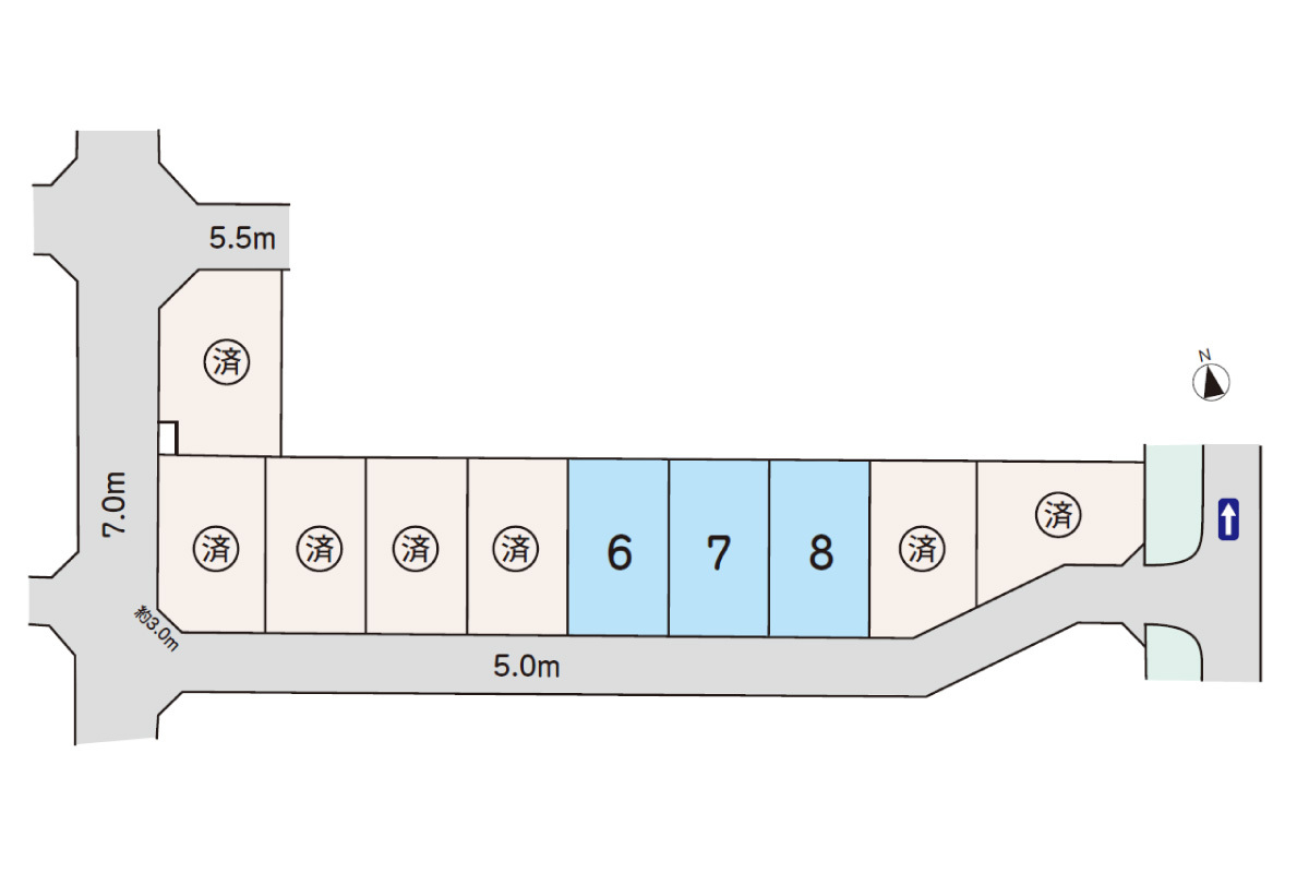 | 駐車場 | 3台 | 道路の幅員 | 南側(開発道路)5m、東側50.0m、西側7.0m、北側5.5m |