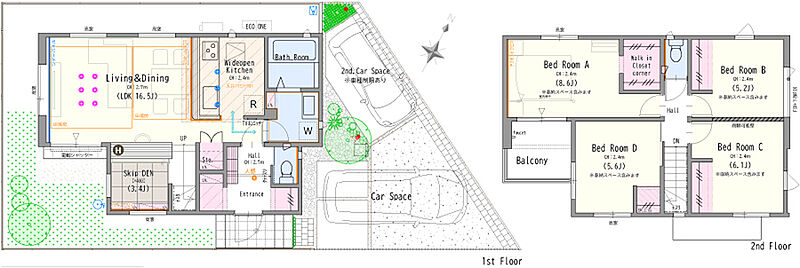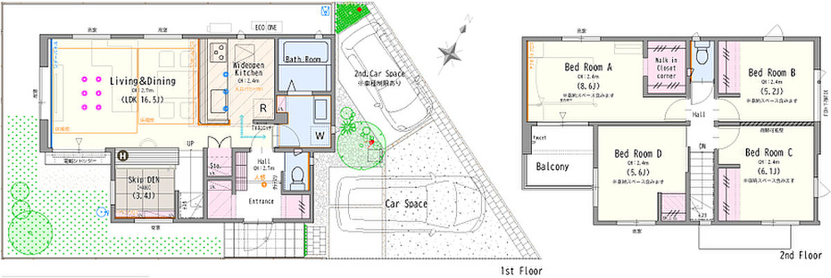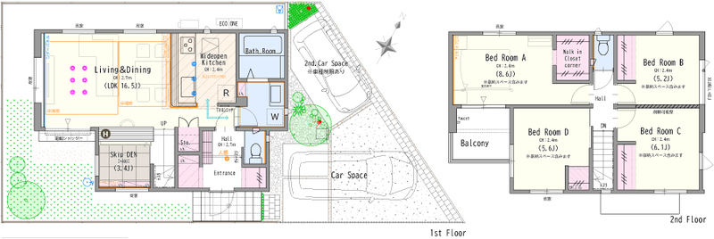- 4LDK(3LDK対応可※オプション)+土間クローク+SKIP DEN+パントリー+ウォークインクロゼットコーナー ~ 5LDK+土間クローク+パントリー+2ウォークインクロゼットコーナー+2Wayバルコニー
