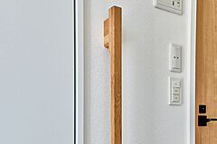 玄関には銘木の質感を活かした高級感としっかり握ることができる安全性にこだわったデザインの手摺を設置しました。※号棟により異