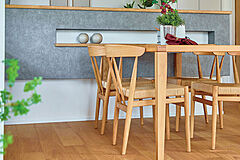無垢材アクセント壁パネル「木もれ美」をダイニング側に採用。食卓に柔らかな木の温もりを添えます。