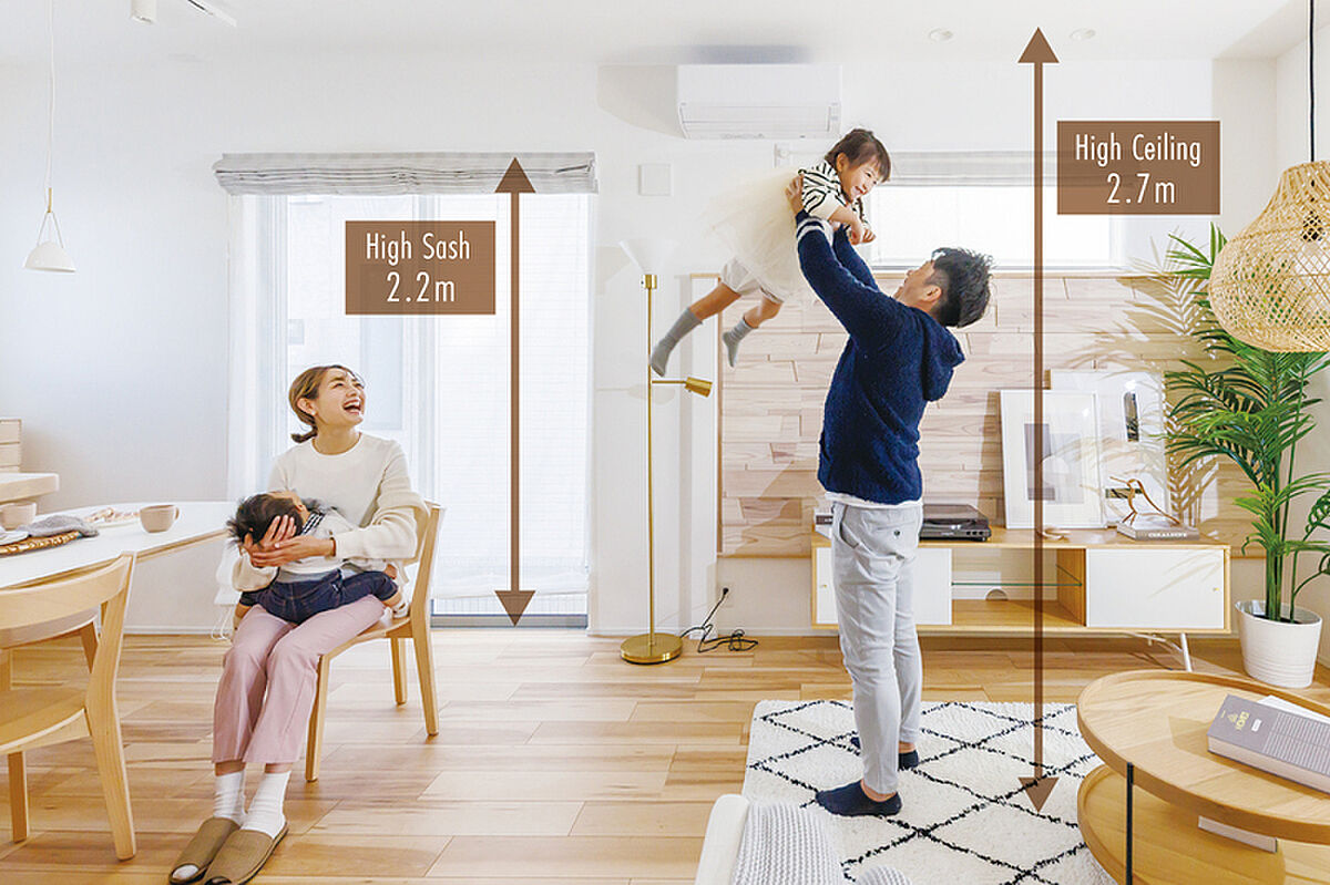 リビングの天井高は2.7m。2.2m高のハイサッシと相まって、開放感あふれる健やかな室内環境をつくり出します。※一部天井が下がる部分がございます。