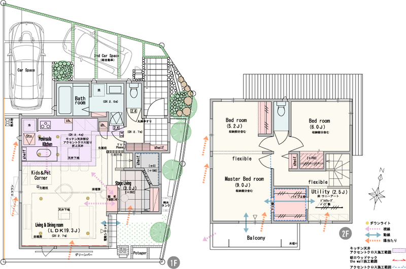 | 間取り | 2LDK(3・4LDK対応可※オプション)+ステージリビング+ユーティリティ+ウォークスルークロゼットコーナー+土間収納(棚)+パントリー+リネン棚 ~ 4LDK+土間収納+パントリー+リネン庫+ウォークインクロゼットコーナー | 建物構造 | 木造2階建(在来工法) |