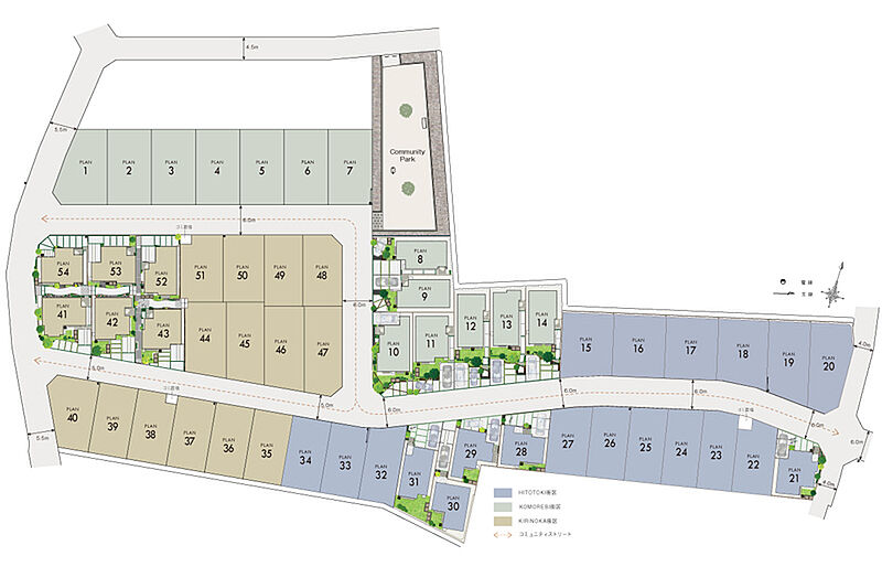 異なるテーマツリーやエクステリアコンセプトが個性を生み出し、森のような美しい街並を描き、オープン外構やライティングなどの安心設計や沿道のベンチが、あたたかなコミュニティを形成します。