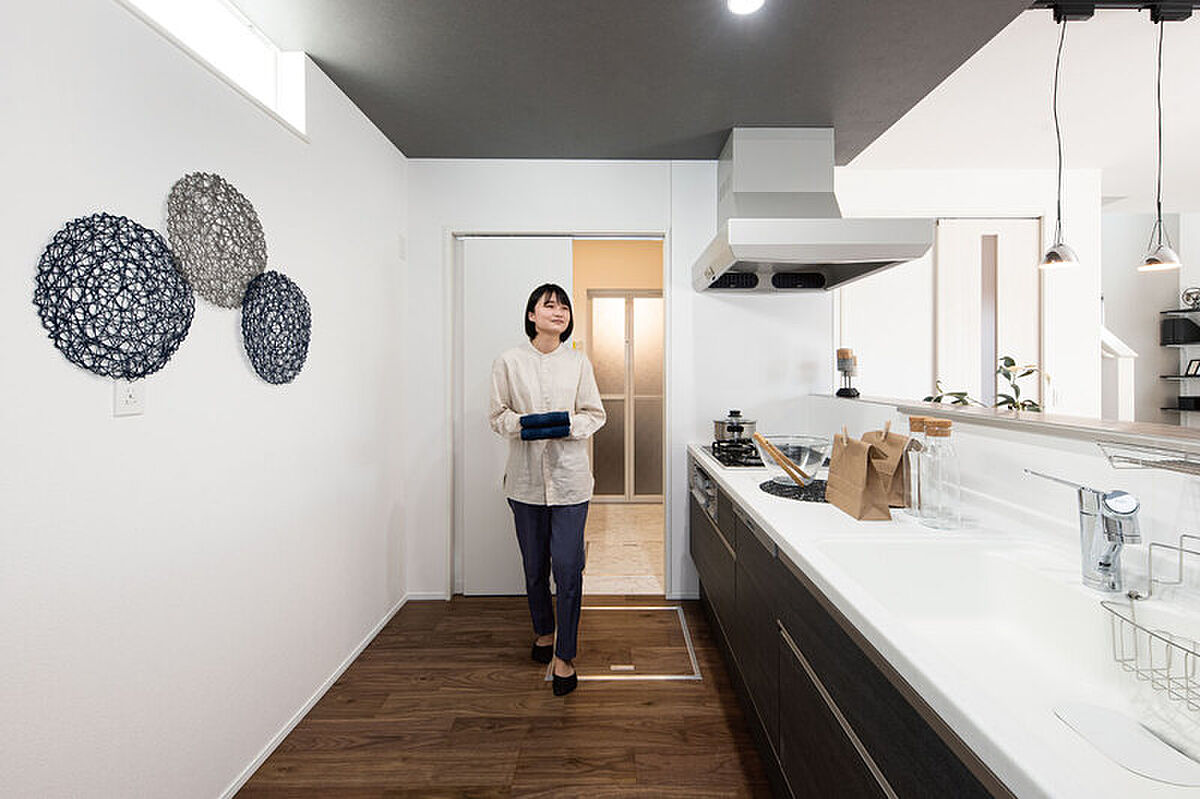 心地よく料理や後片付けができるほか、作業をしながらリビングダイニングにいる家族とのコミュニケーションも楽しめるキッチンです。