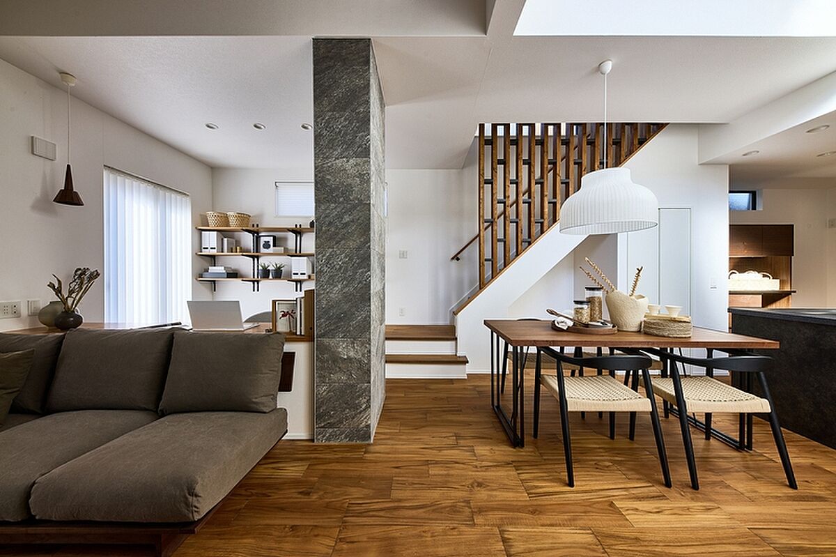 階段部分に木の質感が映える半柱を設置しました。大胆かつ洗練され...