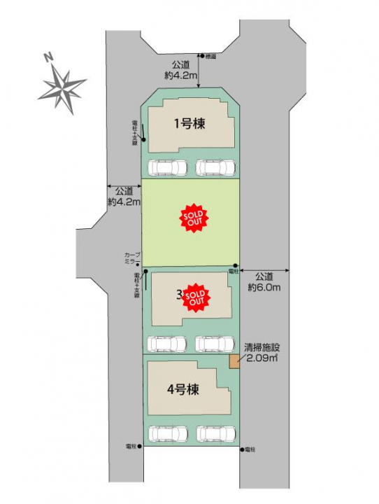 | 駐車場 | 2台 | 道路の幅員 | 東6.0m公道、北4.2m公道、西4.2m公道 |