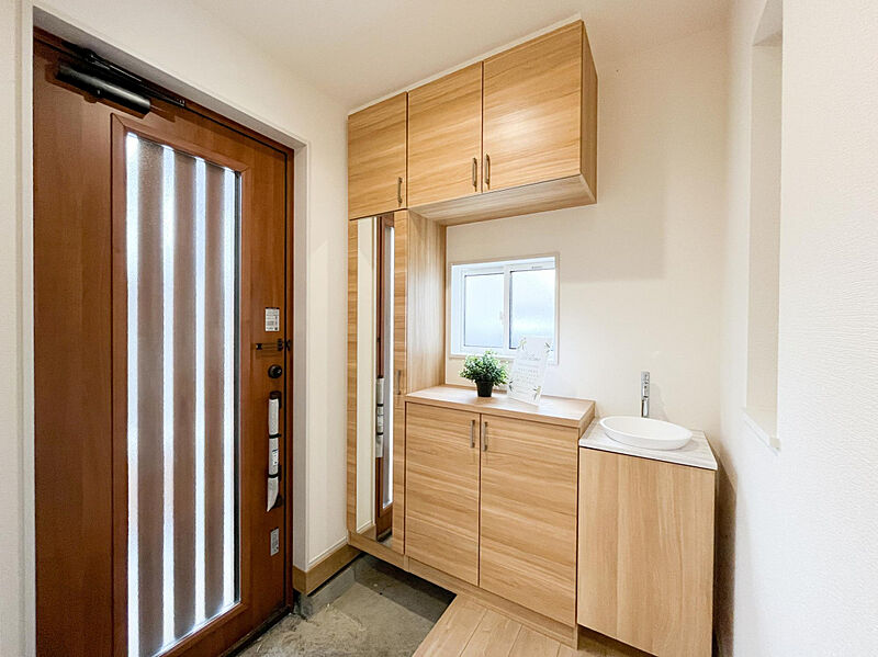小窓とガラス入りドアから自然光が差し込む明るい玄関。たっぷり収...