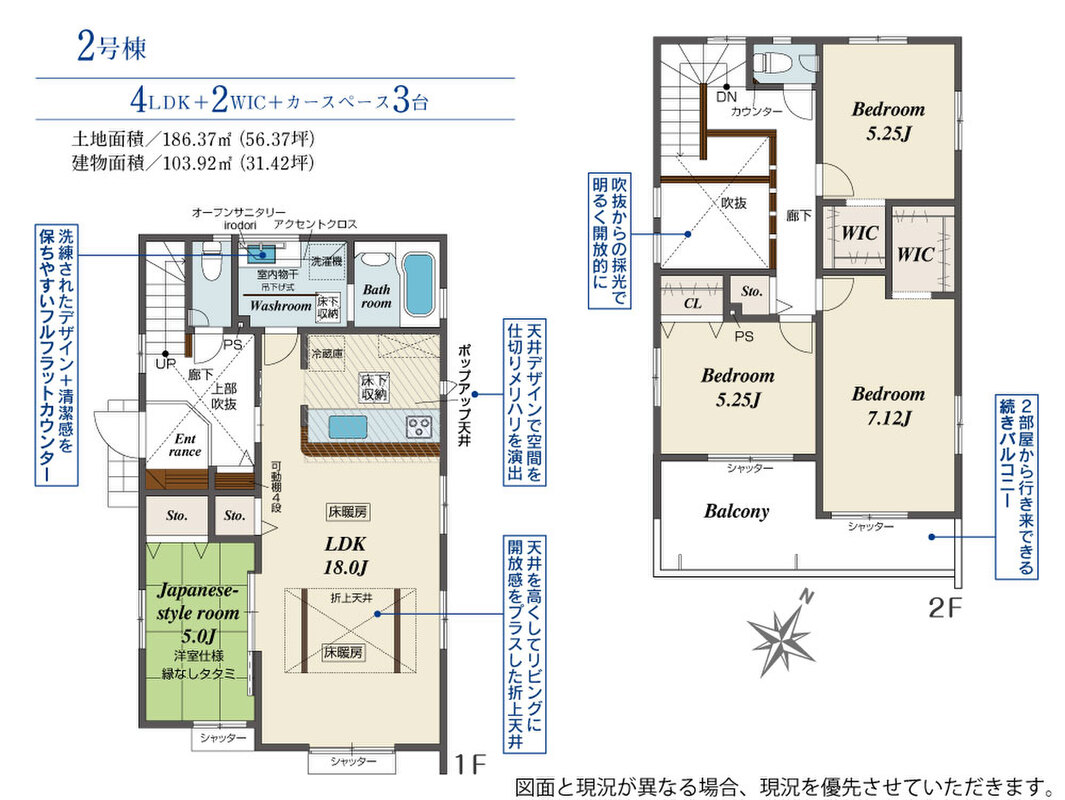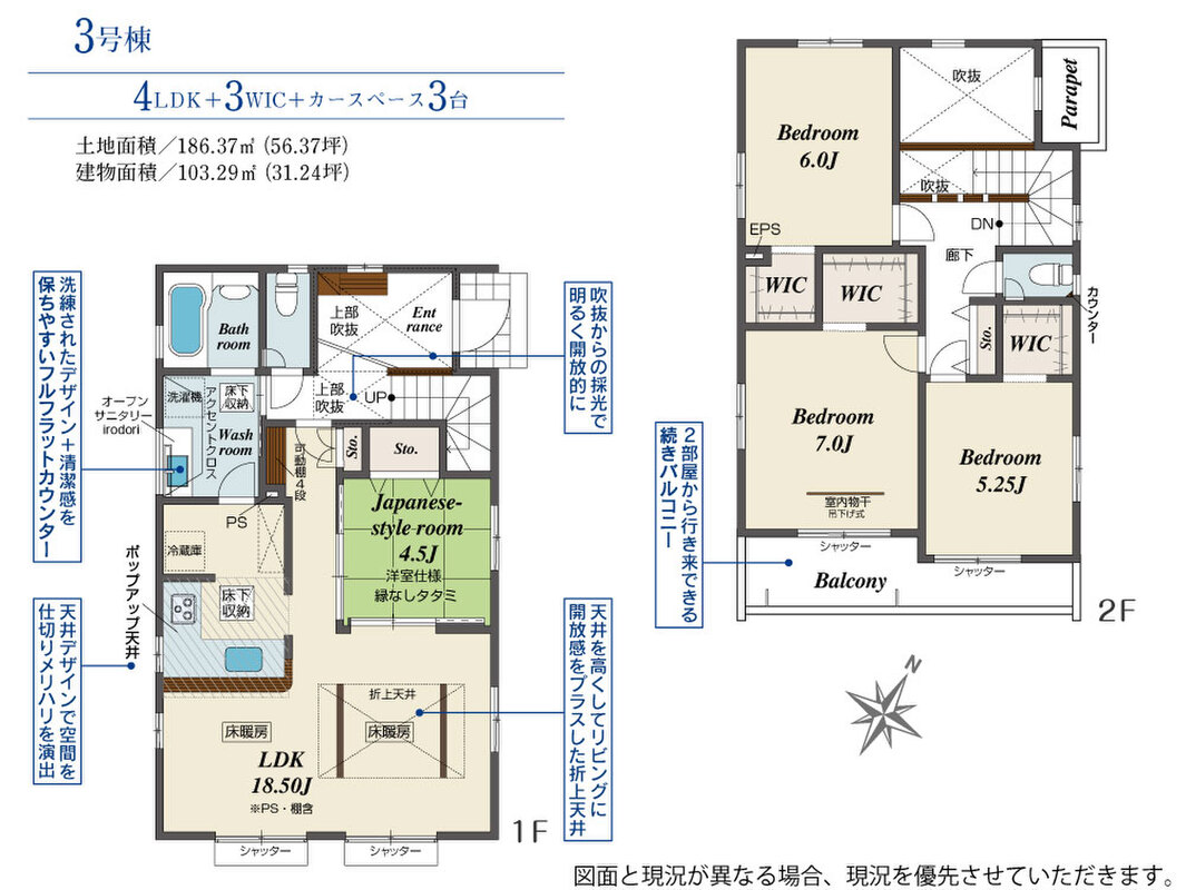 | 建物面積 | 103.29m2~104.37m2 | 土地面積 | 186.37m2(4区画) |