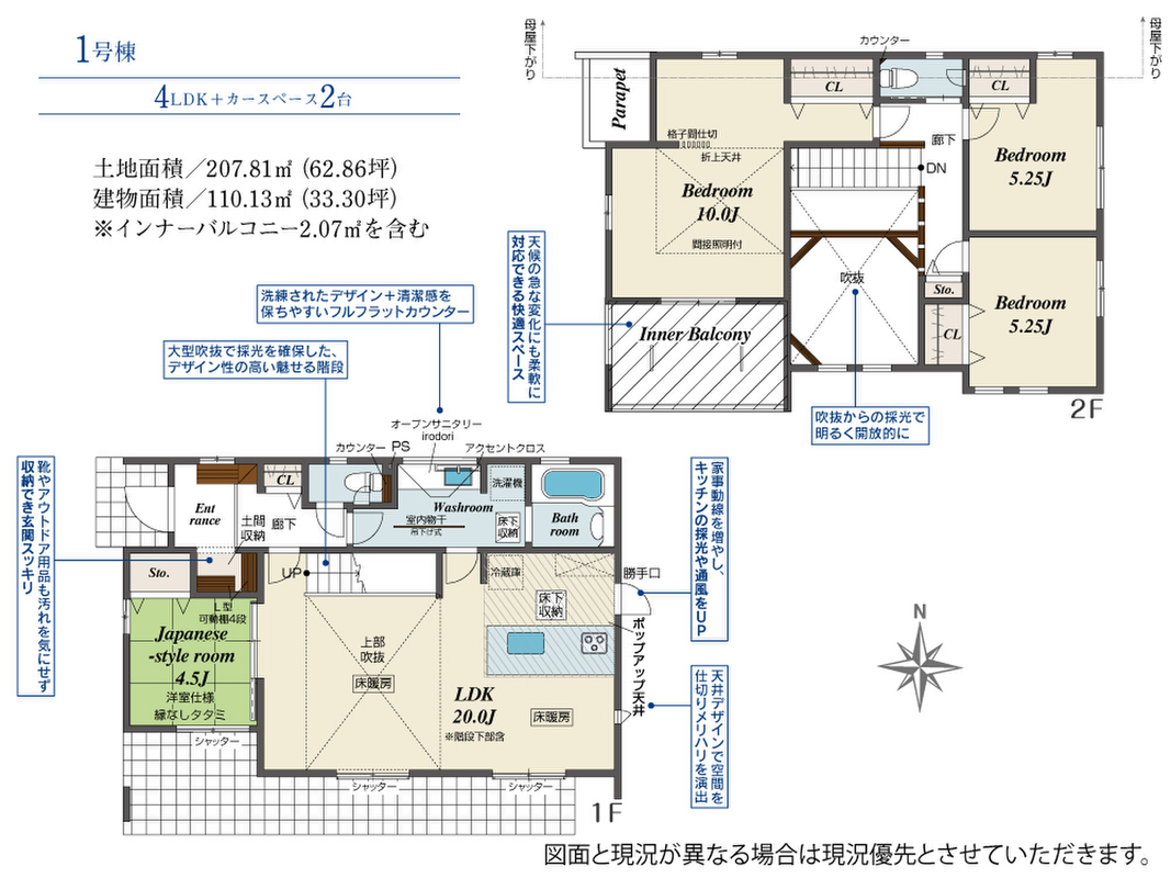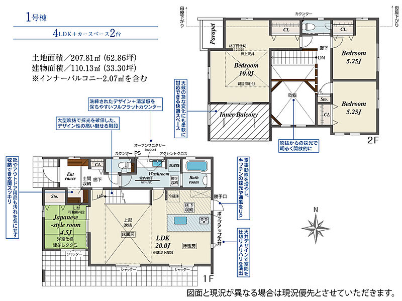| 建物面積 | 110.13m2(インナーバルコニー2.07m2含む) | 土地面積 | 207.81m2 |
