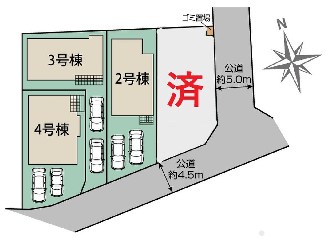 | 駐車場 | 1台 ~ 2台(※4号棟小型車一台含む) | 道路の幅員 | 南西4.5m公道、南東5.0m公道 |
