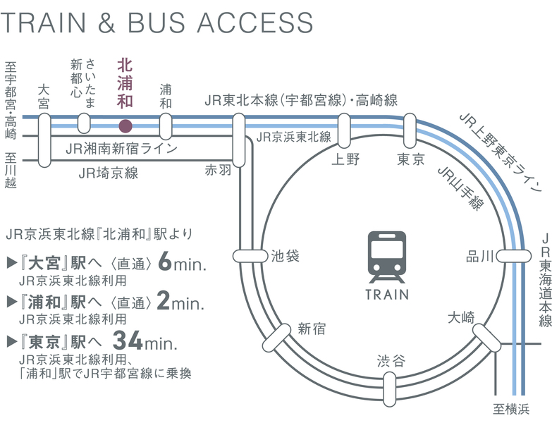 JR京浜東北・根岸線「北浦和」駅 バス7分 市営アパートバス停 徒歩10分 JR東北本線「さいたま新都心」駅 バス18分 JR社員寮前バス停 徒歩6分 JR東北本線「大宮」駅 バス35分 JR社員寮前バス停 徒歩6分 |