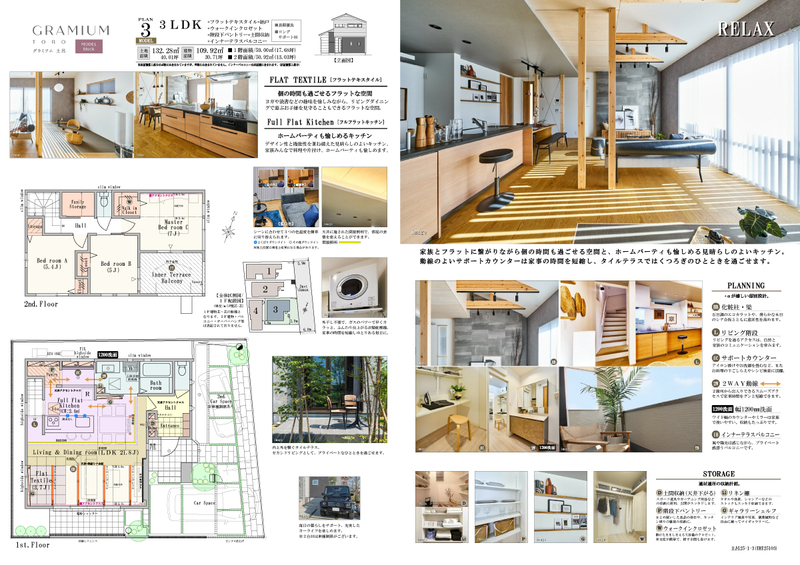 | 間取り | 3LDK+フラットテキスタイル+納戸+ウォークインクロゼット+階段下パントリー+土間収納+インナーテラスバルコニー | 建物構造 | 木造2階建(在来工法) |