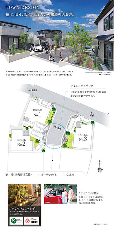 ※2号棟は地盤改良を行います。 ※上記金額には消費税(10%相当額)、水道分担金が含まれております。 ※消費税率改正による増税時は、相当額の負担が発生致します。 ※テレビ視聴・電話・インターネット接続等に関しての費用はお客様負担となります。 ※地域によってはTVの映りが悪くなり、ブースターが必要となる場合があります。 その場合、費用はお客様負担となりますので予めご了承ください。 ※建物に一部が下がり壁、勾配天井、下がり天井になる場合があります。 また、階段の上にある収納で一部床が上がることがあります。詳細は設計図書でご確認下さい。 ※床面積算入部分は、m2数には含まれていますが、坪数には含まれていません。 ※灯かりのいえなみ協定(R)がございます。別紙ご確認ください。 ※建物・外構等に関する確認書がございます。別紙ご確認ください。 ※物件パンフレット及び間取り集は販売用の資料になりますので、最終的な図面は設計図書でご確認下さい。 ※「フラット35S」の金利Aプランに標準対応しています。 ※本物件はGVS3システム(通気金具工法+第3種換気(機械排気・自然給気)システム)を採用しています。 ※「住宅省エネルギー性能説明書」の発行には11,000円(税込み)の費用がかかります。 詳しくは、「住宅ローン控徐及び贈与税非課税枠に関する確認書(1)」をご確認ください。 ※ゴミ集積所は共有部分・共同管理となります。詳細は別途資料をご参照ください。 ※2号棟は高圧線下となります。2号棟敷地面積122.80m2(19.64m2は高圧線下) 分筆前の為高圧線下面積は概算です。分筆後面積が増減する可能性があります。 [設備]公営水道/東京電力・他/都市ガス/本下水/カースペース/植栽その他付帯設備一式 |