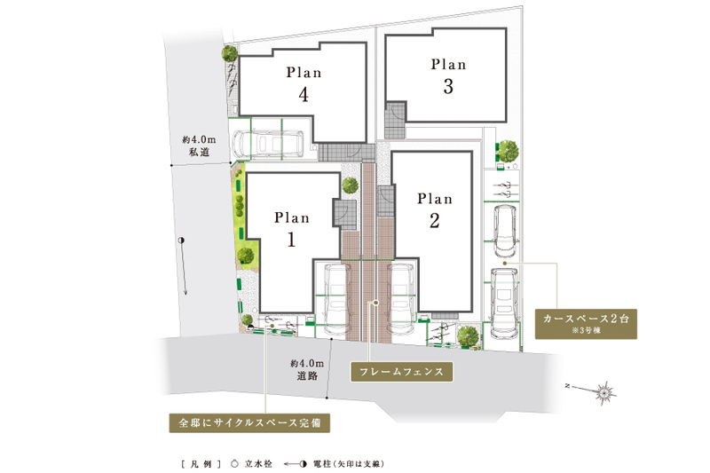 ※3号棟は抽選販売となります。(要望書受付締切:2026年7月9日(木)17時00分、抽選:同日17時30分~) ※私道負担該当号棟は4号棟です。 ※駅・各施設までの徒歩所要時間(距離)は、「最も遠い号棟を起点」に計測しております。 [設備]公営水道/東京電力・他/都市ガス/本下水/カースペース/外構/植栽その他付帯設備一式 |