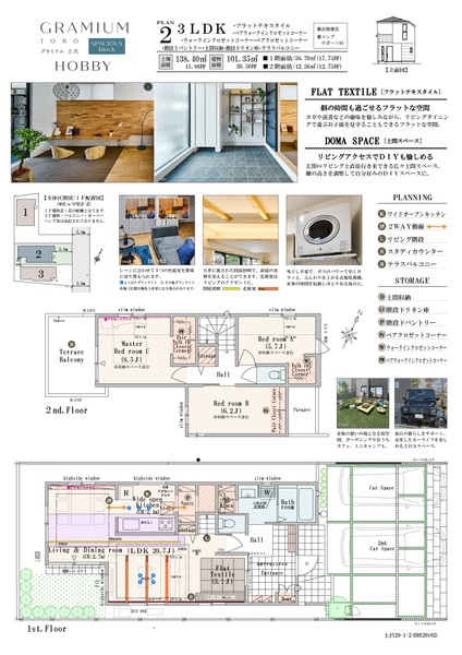 | 間取り | 3LDK+フラットテキスタイル+ペアウォークインクロゼットコーナー+ウォークインクロゼットコーナー+ペアクロゼットコーナー+階段下パントリー+土間収納+階段下リネン庫+テラスバルコニー | 建物構造 | 木造2階建(在来工法) |