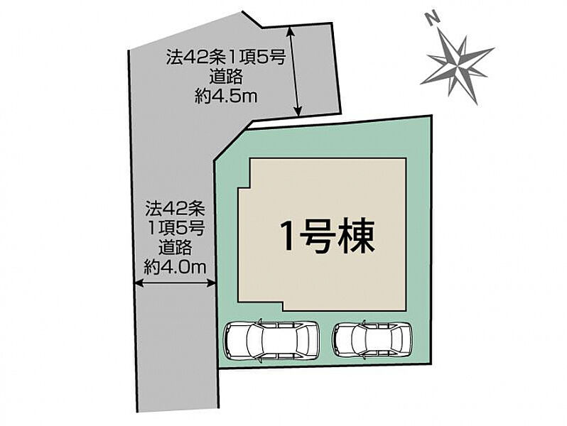 | 駐車場 | 2台 | 道路の幅員 | 西4.0m 法42条1項5号道路、北4.5m 法42条1項5号道路 |