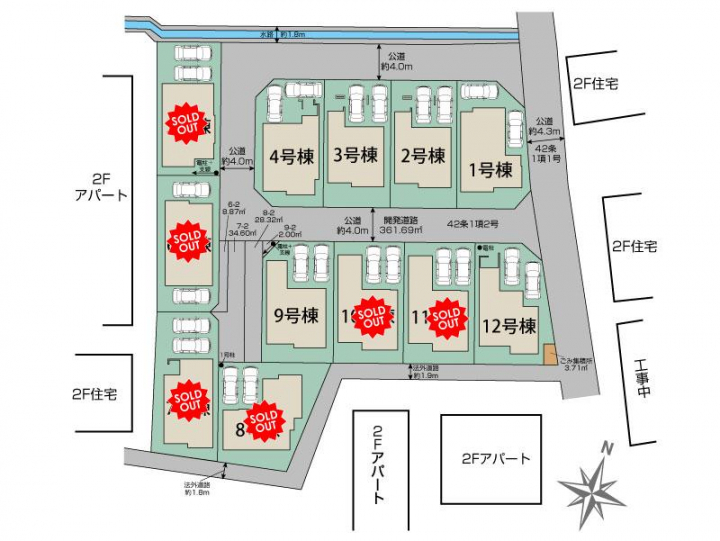 【接道】東4.3m公道、北側4.0m公道、南4.0m公道、西4.0m公道 【設備】公営水道、東京電力、都市ガス、本下水 【協定道路】敷地面積に含む 6号棟8.87m2、7号棟34.60m2、8号棟28.32m2、9号棟2.0m2 地役権登記の費用4万円(税込) 【セットバック】不要 【その他法令】第一種高度地区・地役権・埋蔵文化財 【備考】太陽光発電システムについてはリース契約になります。リース契約期間は10年間、毎月利用料金は1・12号棟:8,899円(税込)、2・3号棟:9,108円(税込)、4・8号棟:8,954円(税込)、5号棟:8,338円(税込)、6号棟:9,075円(税込)、7号棟:9,339円(税込)、9・10・11号棟:9,647円(税込)、がかかります。期間終了後は無償譲渡されます。※詳細は営業担当にお問い合わせください。 ※北側水路あり水路側擁壁予定です。南側及び西側及び北側に高低差あります。 ※埋蔵文化財包蔵地(不動谷中遺跡・集落跡、土器・縄文時代) ※水害履歴:平成17年9月4~5日大雨の影響で道路冠水あります。地歴:竹林(斜面) ※南西道路(法外道路)の対面に墓地あります。 ※南側約50m先にパチンコ店、南側約100m先に幹線道路・道場三室線あります。 ※東側約50m先にショッピングモールクイズゲート浦和あります。 【その他持分】【ゴミ置場】3.71m<sup>2</sup>×各1/12 |
