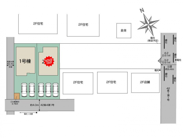 【接道】南側4.0m公道、東側9.4m公道 【設備】公営水道、東京電力、都市ガス、本下水 【路地状部分】3号棟:52.87m2 【協定道路】敷地面積に含む 3号棟:0.51m2、4号棟:0.51m2 【セットバック】不要 【その他諸費用】3、4号棟:地役権登記の費用 4万円(税込) 【その他持分】【ゴミ置き場】3.78m<sup>2</sup>×各1/4 |