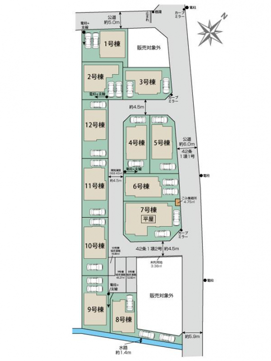 高崎線 北本駅まで自転車14分(3.30km)【※自転車・車の所要時間は実測による】 【接道】北5.0m公道、東6.0m公道 【設備】公営水道、東京電力、都市ガス、本下水 【協定道路】敷地面積に含む 8号棟:32.82m2、9号棟:43.27m2、10号棟:10.80m2 【その他法令】小規模開発 【その他諸費用】8、9、10号棟 地役権登記の費用:4万円(税込) 【備考】太陽光発電システムに伴う東京ガスが提供するサービス契約が必須となります。※詳細は営業担当までお問い合わせください。 ※本物件北側は古綾瀬川流域(草加市管理の水路)があります。又、北東側水路敷に既存ゴミ集積所があります。 ※本物件東側道路上に電柱支線があります。 ※水害履歴:本物件は冠水履歴ありませんが、近隣では、冠水履歴があります。 又、今後の気象状況により何らかの被害が出る可能性あります。 ※本物件南側約200m先にそうか公園通り、東側約300m草加産業道路、西側約300mに綾瀬川・日光街道があります。 ※本物件周辺にはアパート・駐車場・マンションが点在しており、騒音・振動・土埃等が発生する可能性がございます。 ※本物件北側には、水路及びゴミ集積所があり、季節の降雨量や状況に依って水位上昇・害虫・臭気等が発生する可能性がございます。 【その他持分】【ごみ集積所】4.75m<sup>2</sup>×各1/12【未利用地】3. 38m<sup>2</sup>×各1/12 |