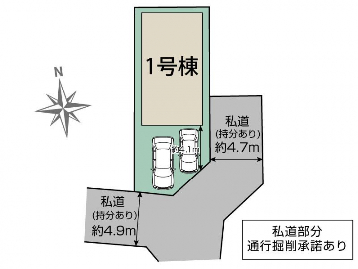 | 駐車場 | 2台 | 道路の幅員 | 南約4.9m私道、東約4.7m私道 |