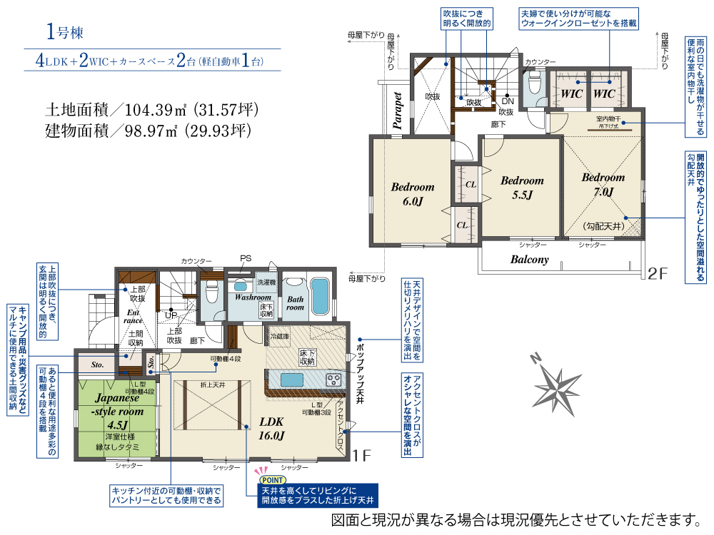 | 建物面積 | 94.40m2(約28.55坪)~98.97m2(約29.93坪) | 土地面積 | 104.39m2(約31.57坪)~106.59m2(約32.24坪) |