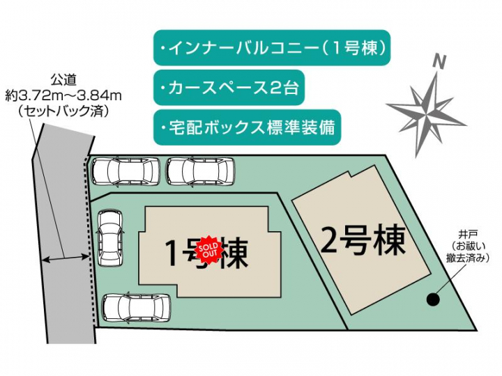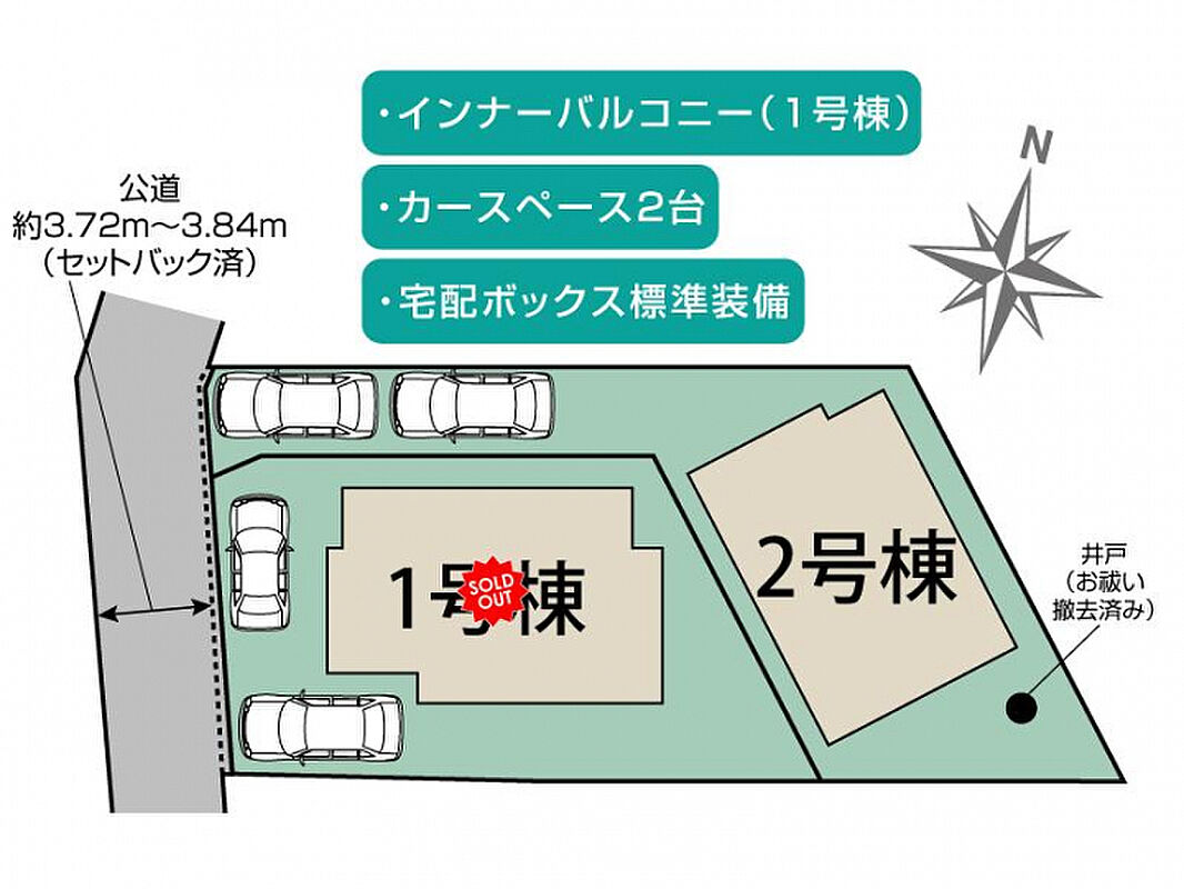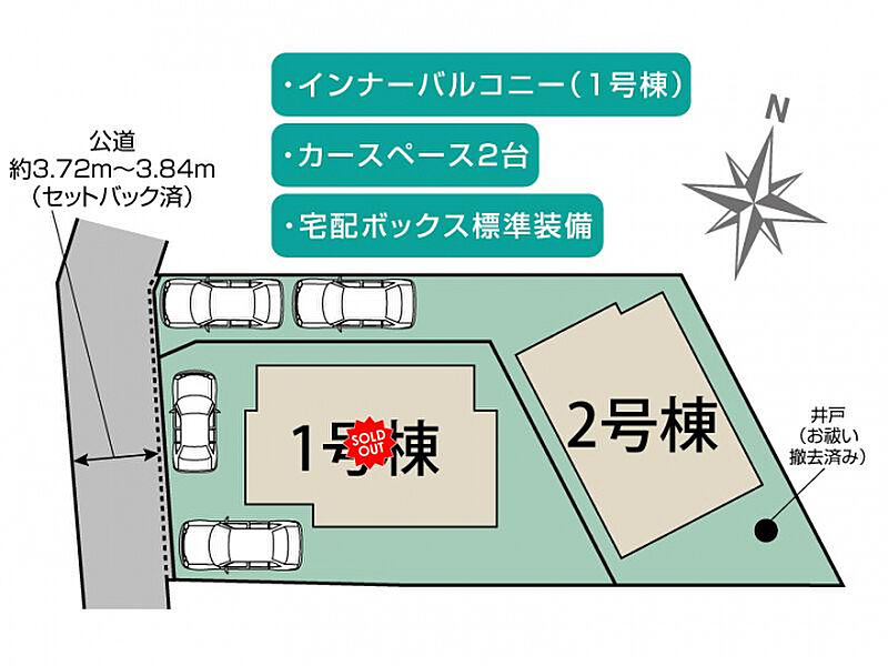 | 駐車場 | 2台 | 道路の幅員 | 西3.72m~3.84m公道 |