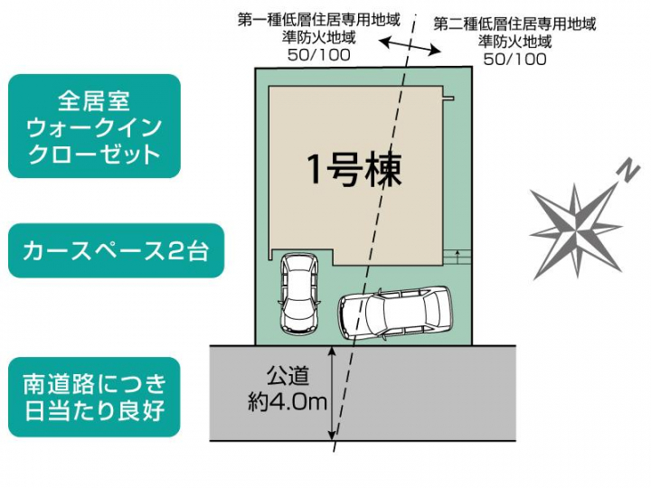 | 駐車場 | 2台 | 道路の幅員 | 南東4.0m公道 |