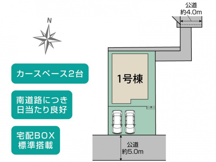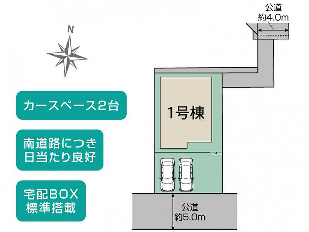 | 駐車場 | 2台 | 道路の幅員 | 南5.0m公道、北4.0m公道 |