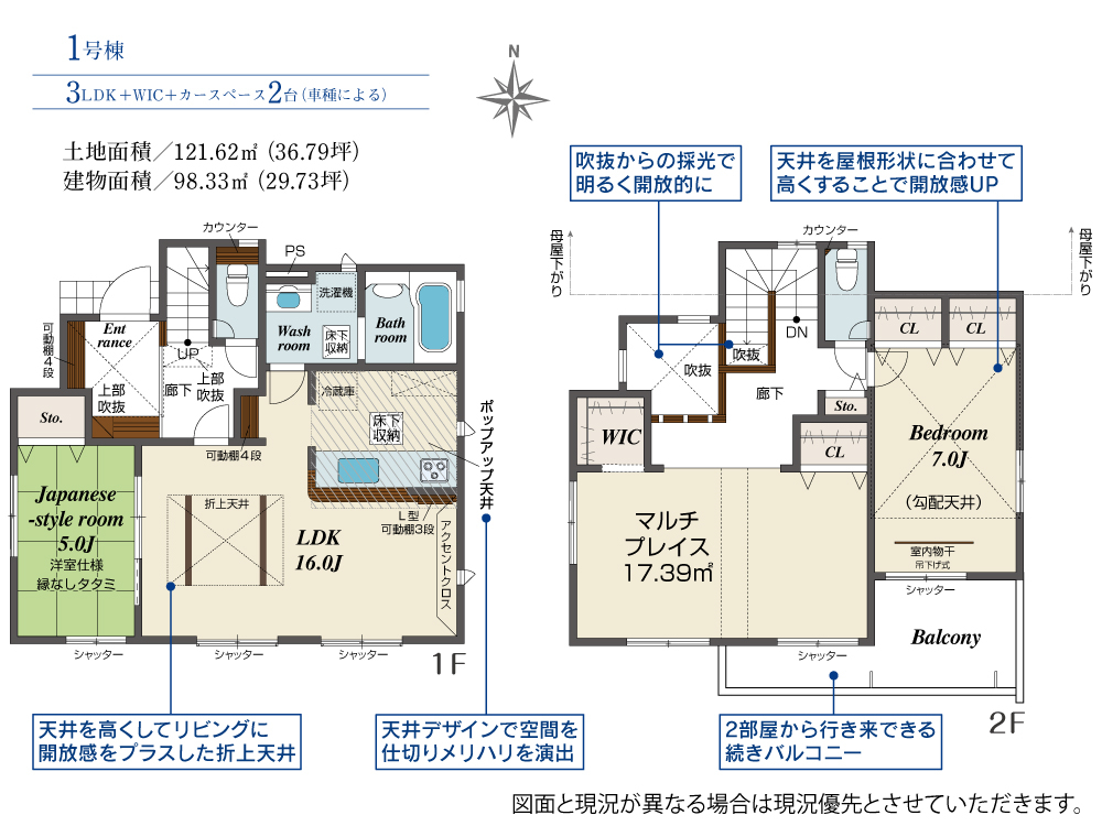 1号棟 間取り 3LDK 価格 3380万円 建物面積 98.33m2 土地面積 121.62m2 -