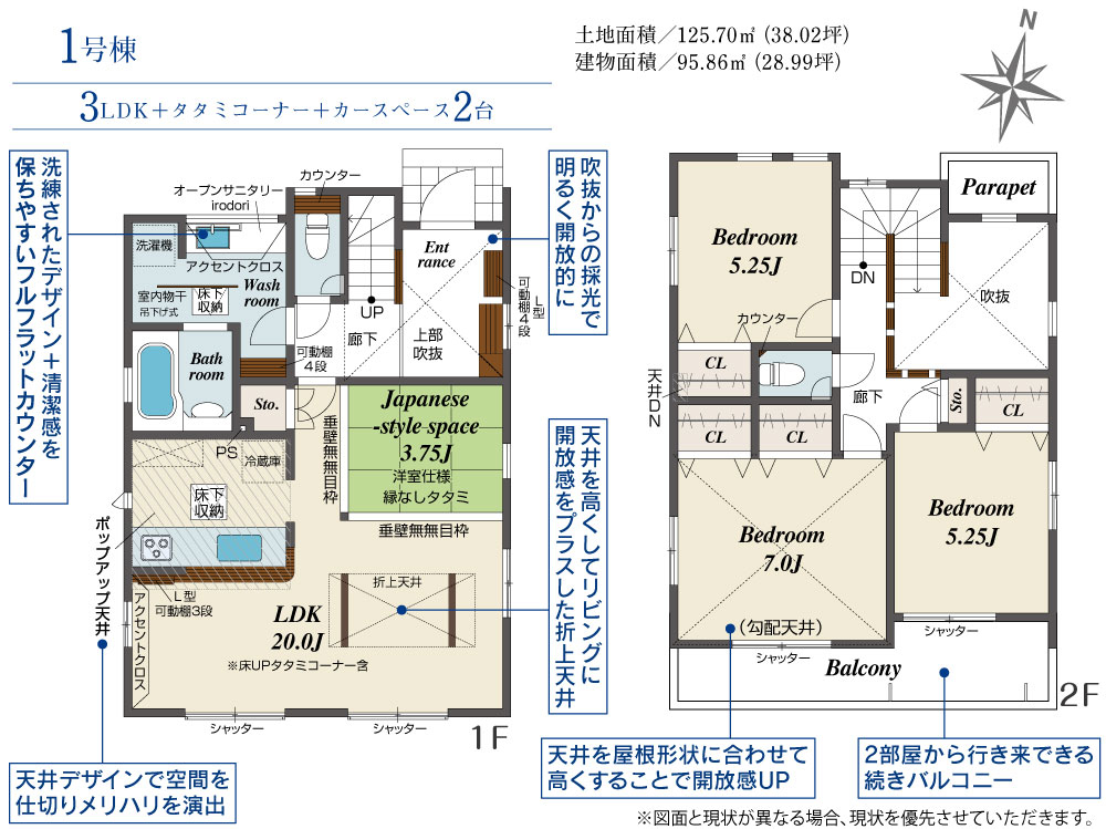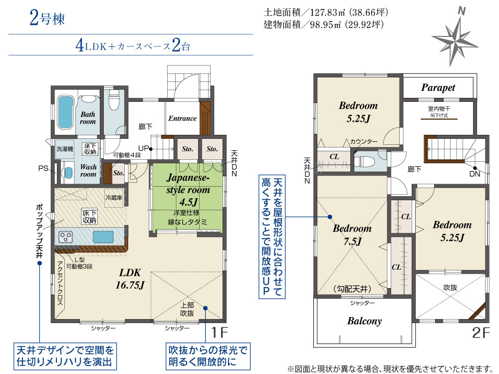 | 建物面積 | 95.86m2(約28.99坪)~98.95m2(約29.93坪) | 土地面積 | 125.70m2(約38.02坪)~127.83m2(約38.66坪) |