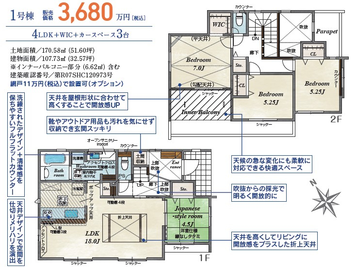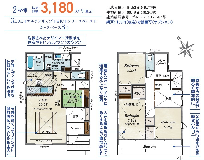 1号棟・LDK一部アクセントクロス・ポップアップ天井・折上天井・洗面台、オープンサニタリー・室内物干し・玄関吹抜・2階インナーバルコニー・勾配天井 2号棟・LDK20帖・マルチスキップ・洗面台、オープンサニタリー・室内物干し・折上天井・ポップアップ天井・LDKアクセントクロス・2階勾配天井
