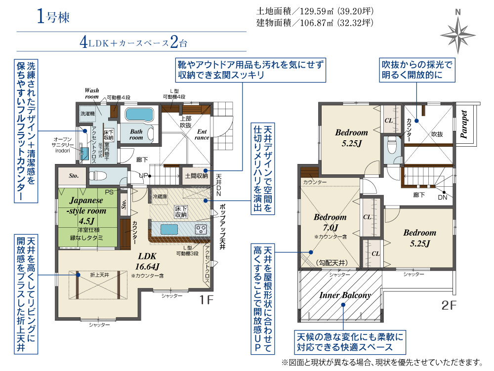 1号棟 間取り 4LDK 価格 3680万円 建物面積 106.87m2 土地面積 129.59m2 -